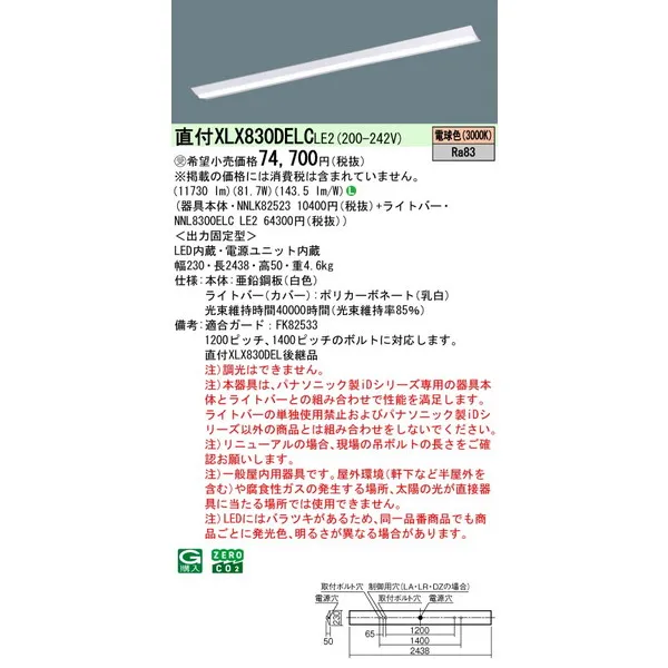 パナソニック iDシリーズ 天井直付型 110形 一体型LEDベースライト Dスタイル W230 富士型 XLX800DEVCLE2 温白色(3500K)