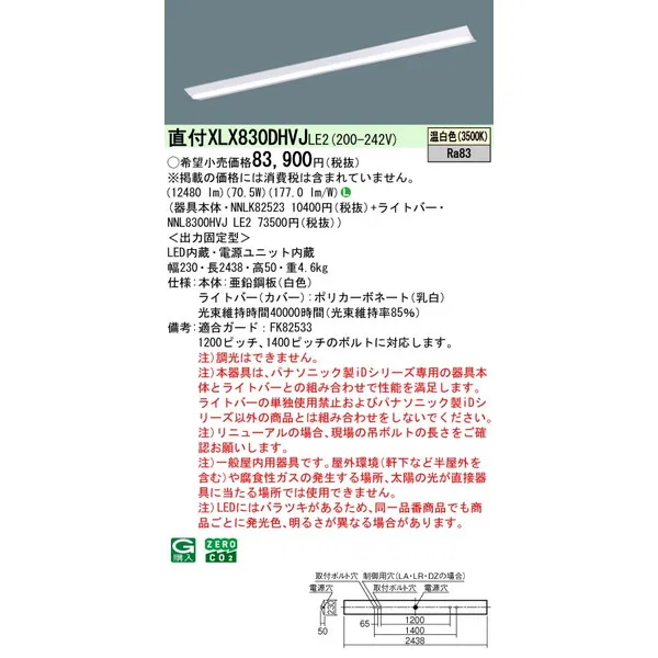 パナソニック iDシリーズ 天井直付型 110形 一体型LEDベースライト Dスタイル W230 富士型 XLX830DHWJLE2 白色(4000K)
