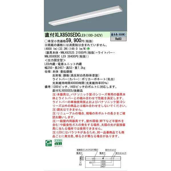パナソニック iDシリーズ 天井直付型 110形 一体型LEDベースライト スリムベース XLX850SEDCLE9 昼光色(6500K)