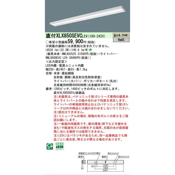 パナソニック iDシリーズ 天井直付型 110形 一体型LEDベースライト スリムベース XLX850SEVCLE9 温白色(3500K)