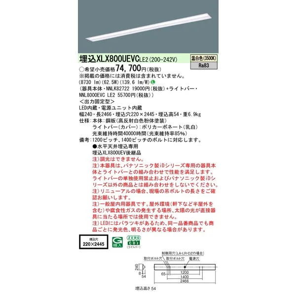 パナソニック iDシリーズ 天井埋込型 110形 一体型LEDベースライト 下面開放型 W220 XLX800UEVCLE2 温白色(3500K)