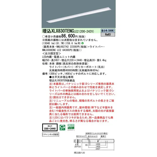 パナソニック iDシリーズ 天井埋込型 110形 一体型LEDベースライト 下面開放型 W220 XLX830TENCLE2 昼白色(5000K)