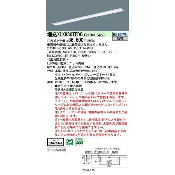 パナソニック iDシリーズ 天井埋込型 110形 一体型LEDベースライト 下面開放型 W220 XLX830TEDCLE2 昼光色(6500K)