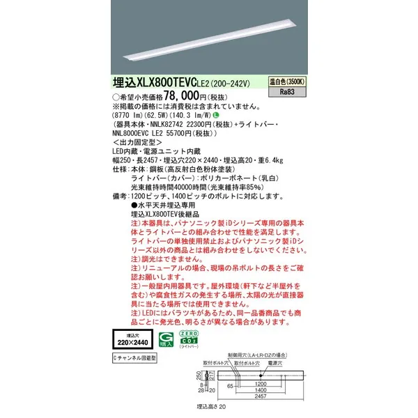 パナソニック iDシリーズ 天井埋込型 110形 一体型LEDベースライト 下面開放型 W220 XLX800TEVCLE2 温白色(3500K)