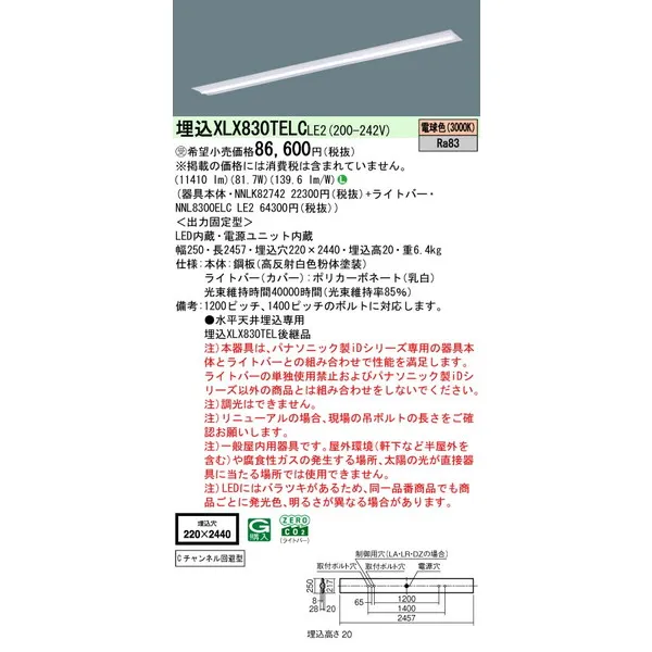パナソニック iDシリーズ 天井埋込型 110形 一体型LEDベースライト 下面開放型 W220 XLX830TELCLE2 電球色(3000K)