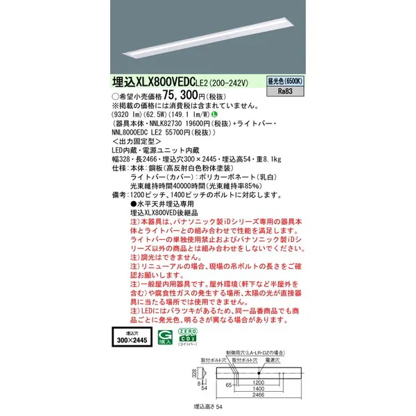パナソニック iDシリーズ 天井埋込型 110形 一体型LEDベースライト 下面開放型 W300 XLX800VEDCLE2 昼光色(6500K)