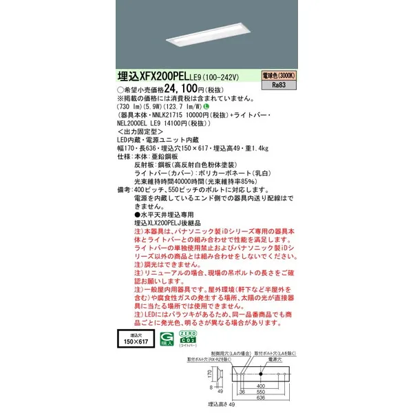 パナソニック iDシリーズ 天井埋込型 20形 一体型LEDベースライト 下面開放型 W150 XFX200PELLE9 電球色(3000K)