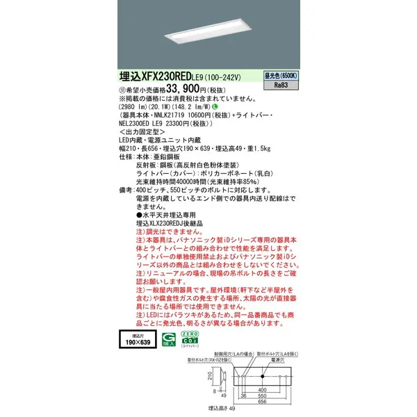 パナソニック iDシリーズ 天井埋込型 20形 一体型LEDベースライト 下面開放型 W190 XFX230REDLE9 昼光色(6500K)