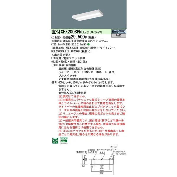 パナソニック iDシリーズ 天井直付型 20形 一体型LEDベースライト スリムベース XFX200SPNLE9 昼白色(5000K)