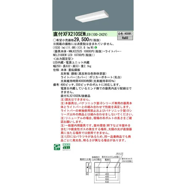 パナソニック iDシリーズ 天井直付型 20形 一体型LEDベースライト スリムベース XFX210SEWLE9 白色(4000K)
