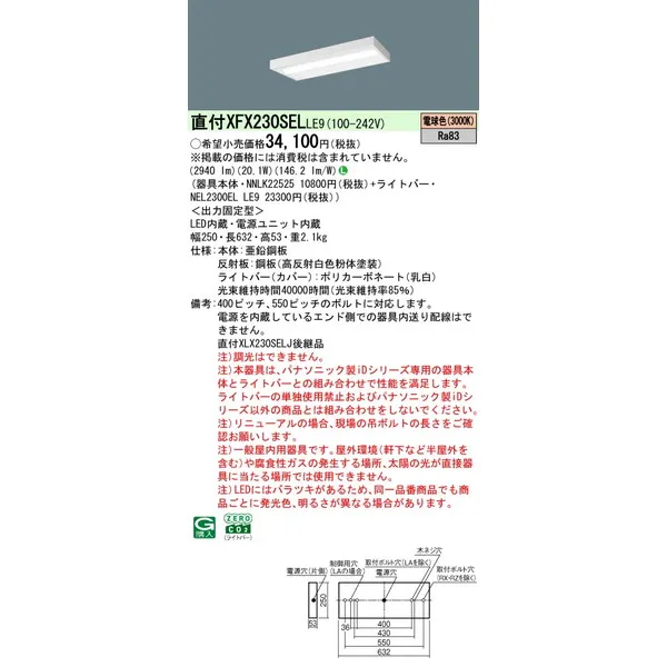 パナソニック iDシリーズ 天井直付型 20形 一体型LEDベースライト スリムベース XFX230SELLE9 電球色(3000K)