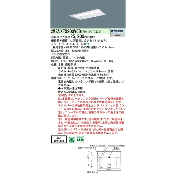 パナソニック iDシリーズ 天井埋込型 20形 一体型LEDベースライト 下面開放型 W300 XFX200VEDLE9 昼光色(6500K)