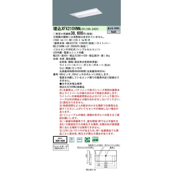 パナソニック iDシリーズ 天井埋込型 20形 一体型LEDベースライト 下面開放型 W300 XFX210VNNLE9 昼白色(5000K)