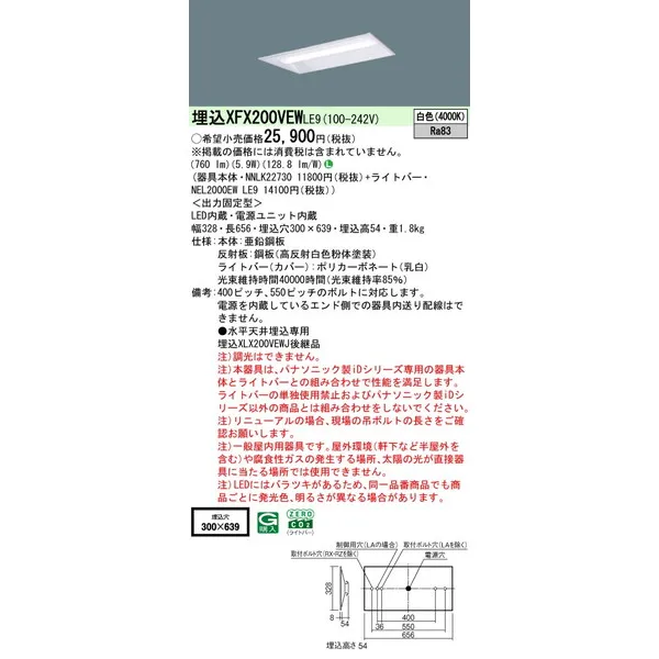 パナソニック iDシリーズ 天井埋込型 20形 一体型LEDベースライト 下面開放型 W300 XFX200VEWLE9 白色(4000K)