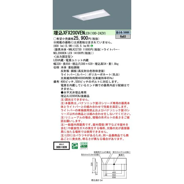 パナソニック iDシリーズ 天井埋込型 20形 一体型LEDベースライト 下面開放型 W300 XFX200VENLE9 昼白色(5000K)