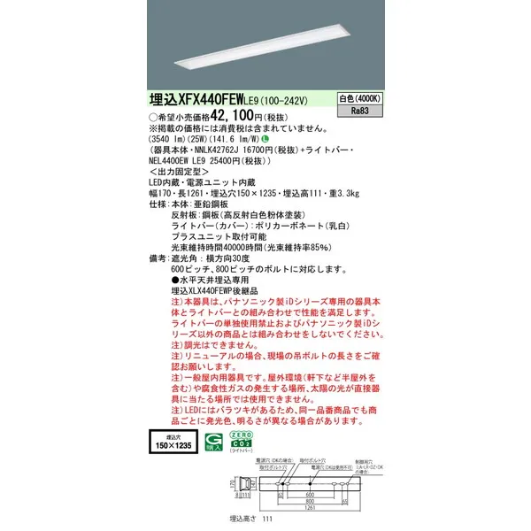 パナソニック iDシリーズ 天井埋込型 40形 一体型LEDベースライト フリーコンフォート W150 XFX440FEWLE9 白色(4000K)