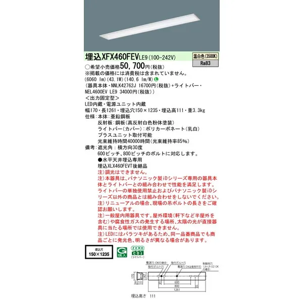 パナソニック iDシリーズ 天井埋込型 40形 一体型LEDベースライト フリーコンフォート W150 XFX460FEVLE9 温白色(3500K)