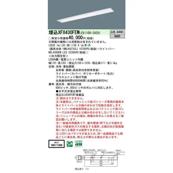パナソニック iDシリーズ 天井埋込型 40形 一体型LEDベースライト フリーコンフォート W150 XFX430FEWLE9 白色(4000K)