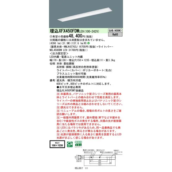 パナソニック iDシリーズ 天井埋込型 40形 一体型LEDベースライト フリーコンフォート W150 XFX450FDWLE9 白色(4000K)