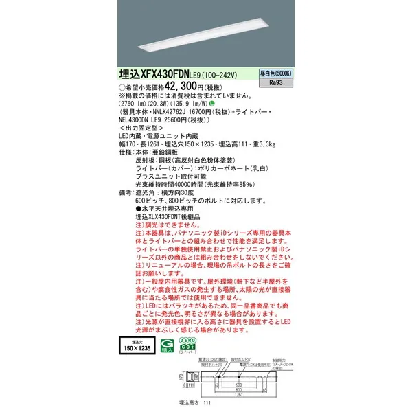 パナソニック iDシリーズ 天井埋込型 40形 一体型LEDベースライト フリーコンフォート W150 XFX430FDNLE9 昼白色(5000K)