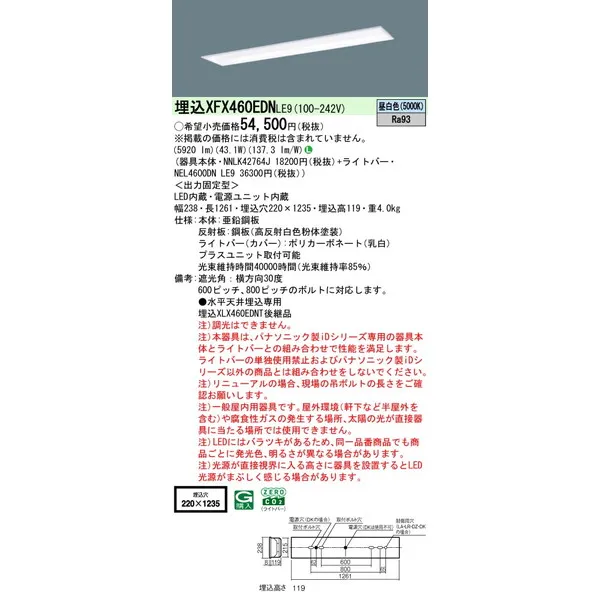 パナソニック iDシリーズ 天井埋込型 40形 一体型LEDベースライト フリーコンフォート W220 XFX460EDNLE9 昼白色(5000K)