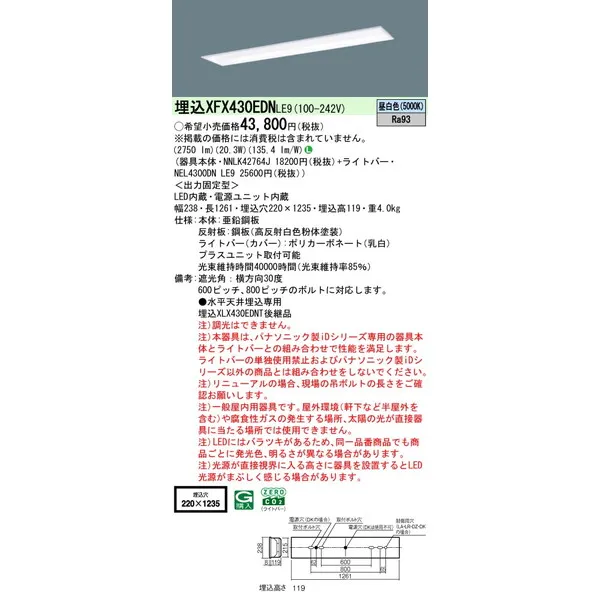 パナソニック iDシリーズ 天井埋込型 40形 一体型LEDベースライト フリーコンフォート W220 XFX430EDNLE9 昼白色(5000K)