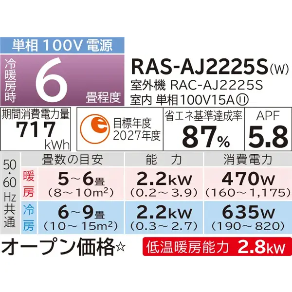 (JIS C 9612:2013)87%/5.8 【冷房】畳数のめやす 6?9畳(10?15m2) 【冷房】能力(kW) 2.2(0.3~2.7) 【冷房】消費電力(W) 635(190?820) 【暖房】畳数のめやす 5?6畳(8?10m2) 【暖房】能力(kW) 2.2(0.2?3.9) 【暖房】消費電力(W) 470(160?1,175) 低温暖房能力 2.8kW外気温2℃時 メーカー保証期間 1年間