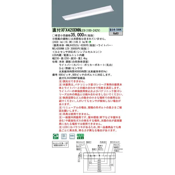 パナソニック iDシリーズ 天井直付型 40形 一体型LEDベースライト Dスタイル W230 富士型 XFX420DNNLE9 白色(4000K)