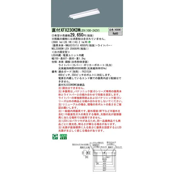 パナソニック iDシリーズ 天井直付型 20形 一体型LEDベースライト 反射笠付 XFX230KDWLE9 白色(4000K)