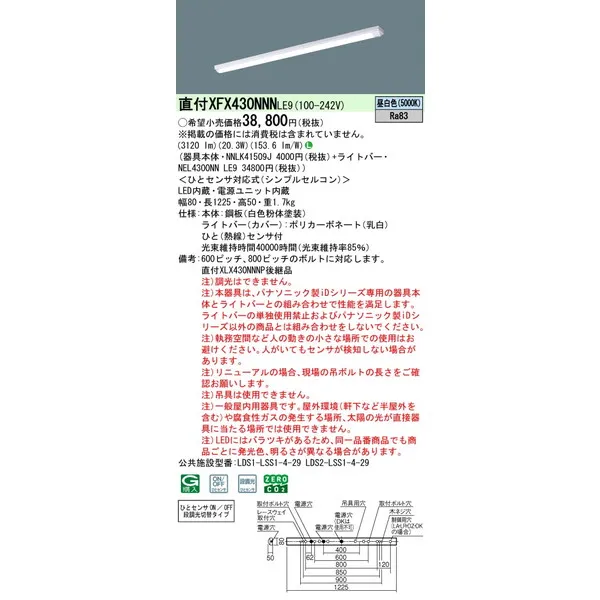パナソニック iDシリーズ 天井直付型 40形 一体型LEDベースライト iスタイル W80 XFX430NNNLE9 昼白色(5000K)