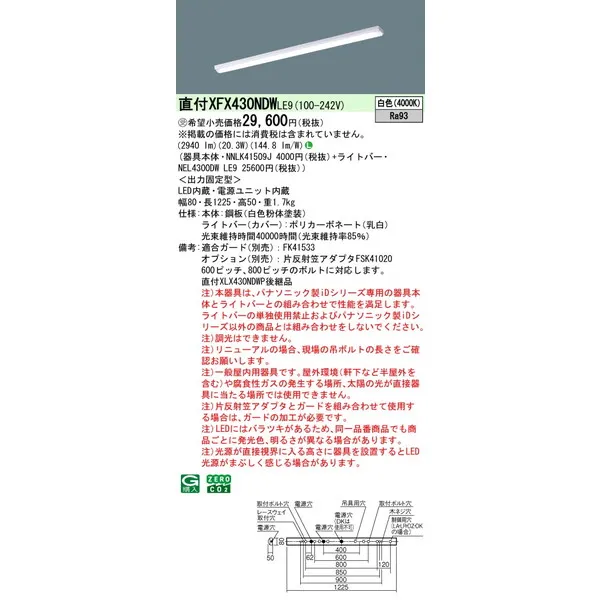 パナソニック iDシリーズ 天井直付型 40形 一体型LEDベースライト iスタイル W80 XFX430NDWLE9 白色(4000K)