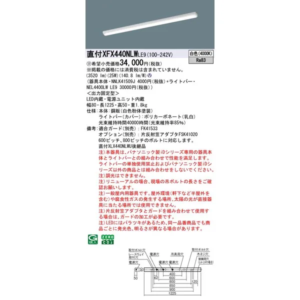 パナソニック iDシリーズ 天井直付型 40形 一体型LEDベースライト iスタイル W80 XFX440NLWLE9 白色(4000K)