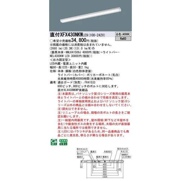 パナソニック iDシリーズ 天井直付型 40形 一体型LEDベースライト iスタイル W80 XFX430NKWLE9 白色(4000K)