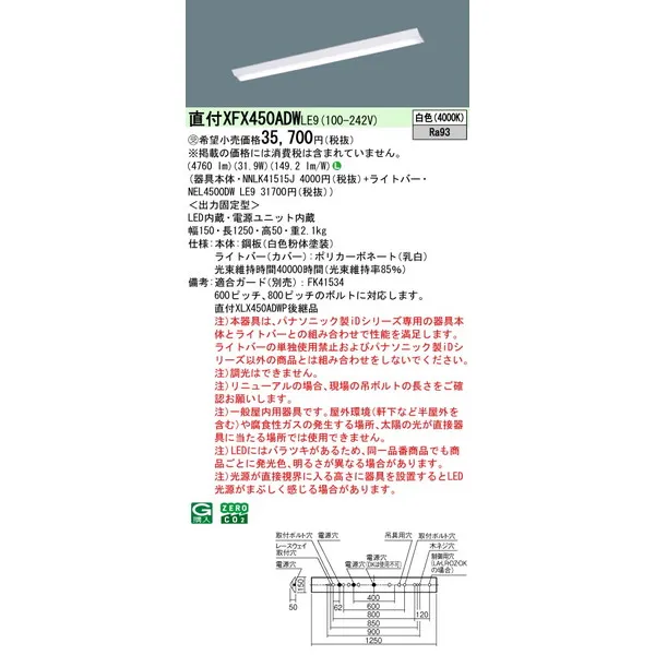 パナソニック iDシリーズ 天井直付型 40形 一体型LEDベースライト Dスタイル W150 富士型 XFX450ADWLE9 白色(4000K)
