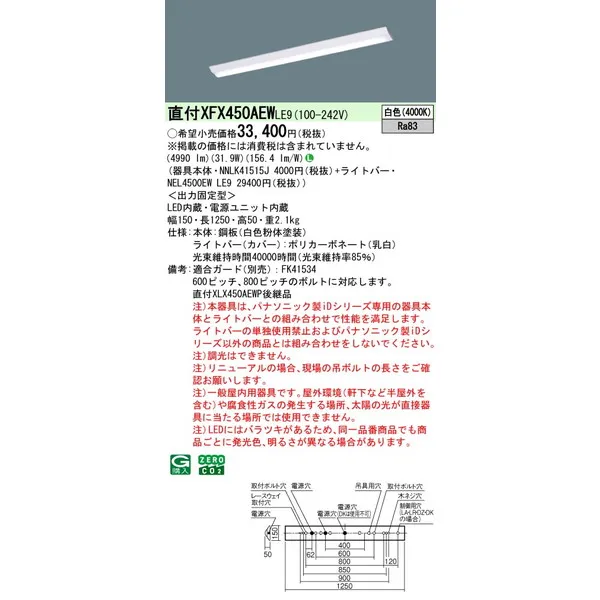 パナソニック iDシリーズ 天井直付型 40形 一体型LEDベースライト Dスタイル W150 富士型 XFX450AEWLE9 白色(4000K)