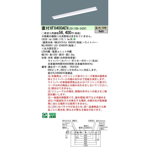 パナソニック iDシリーズ 天井直付型 40形 一体型LEDベースライト Dスタイル W150 富士型 XFX400AEVLE9 温白色(3500K)