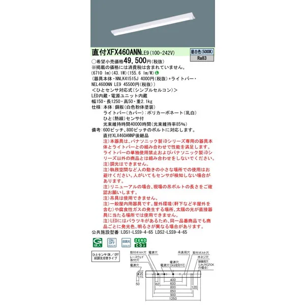 パナソニック iDシリーズ 天井直付型 40形 一体型LEDベースライト Dスタイル W150 富士型 XFX460ANNLE9 昼白色(5000K)