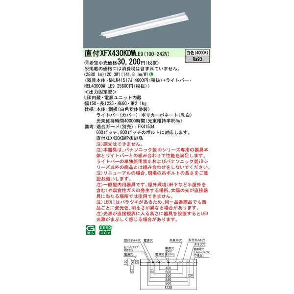 パナソニック iDシリーズ 天井直付型 40形 一体型LEDベースライト 反射笠付 XFX430KDWLE9 白色(4000K)