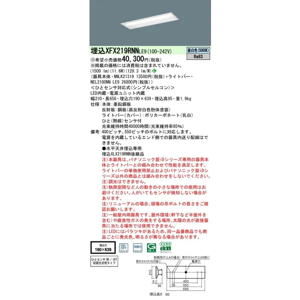 パナソニック iDシリーズ 天井埋込型 20形 一体型LEDベースライト リニューアル 下面開放型 W190 XFX219RNNLE9 昼白色(5000K)