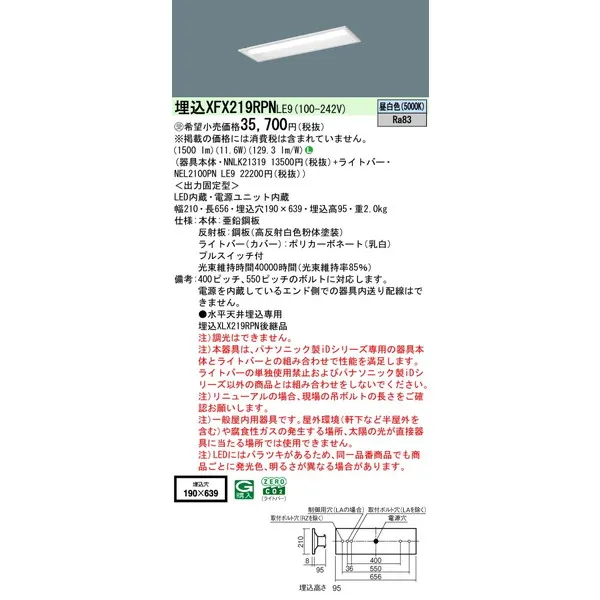 パナソニック iDシリーズ 天井埋込型 20形 一体型LEDベースライト リニューアル 下面開放型 W190 XFX219RPNLE9 昼白色(5000K)