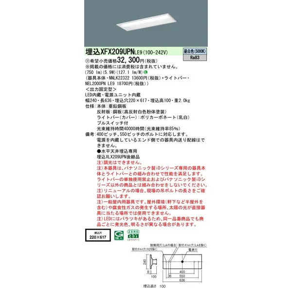 パナソニック iDシリーズ 天井埋込型 20形 一体型LEDベースライト リニューアル 下面開放型 W220 XFX209UPNLE9 昼白色(5000K)
