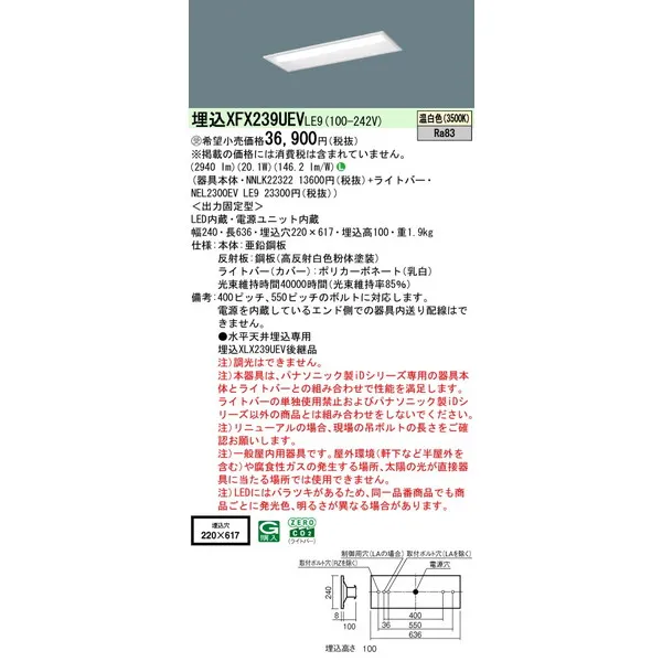 パナソニック iDシリーズ 天井埋込型 20形 一体型LEDベースライト リニューアル 下面開放型 W220 XFX239UEVLE9 温白色(3500K)