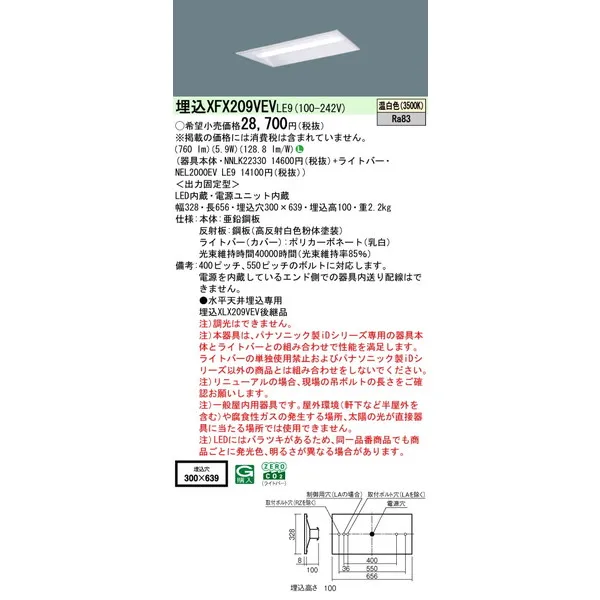 パナソニック iDシリーズ 天井埋込型 20形 一体型LEDベースライト リニューアル 下面開放型 W330 XFX209VEVLE9 温白色(3500K)