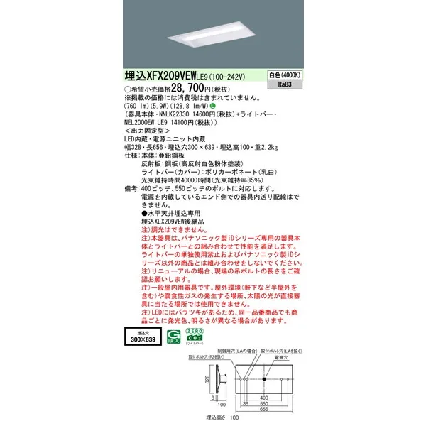 パナソニック iDシリーズ 天井埋込型 20形 一体型LEDベースライト リニューアル 下面開放型 W330 XFX209VEWLE9 白色(4000K)