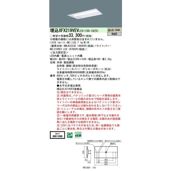 パナソニック iDシリーズ 天井埋込型 20形 一体型LEDベースライト リニューアル 下面開放型 W330 XFX219VEVLE9 温白色(3500K)