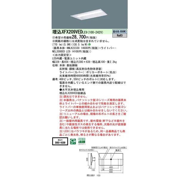 パナソニック iDシリーズ 天井埋込型 20形 一体型LEDベースライト リニューアル 下面開放型 W330 XFX209VEDLE9 昼光色(6500K)