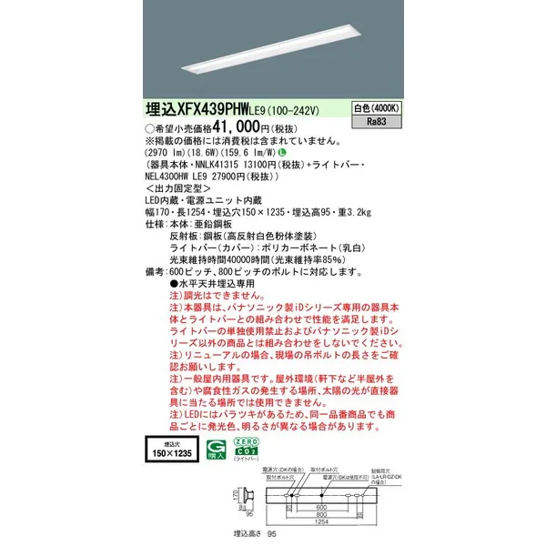 パナソニック iDシリーズ 天井埋込型 40形 一体型LEDベースライト リニューアル 下面開放型 W150 XFX439PHWLE9 白色(4000K)