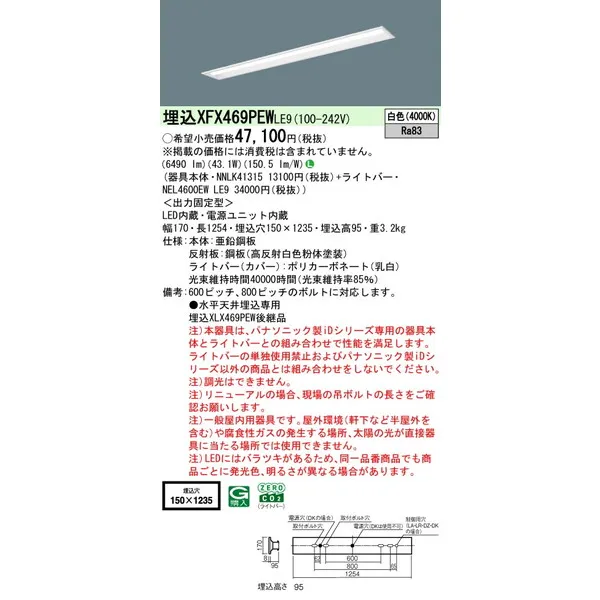 パナソニック iDシリーズ 天井埋込型 40形 一体型LEDベースライト リニューアル 下面開放型 W150 XFX469PEWLE9 白色(4000K)