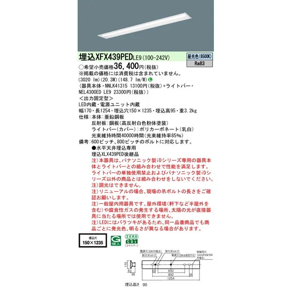 パナソニック iDシリーズ 天井埋込型 40形 一体型LEDベースライト リニューアル 下面開放型 W150 XFX439PEDLE9 昼光色(6500K)