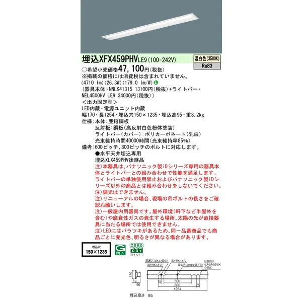 パナソニック iDシリーズ 天井埋込型 40形 一体型LEDベースライト リニューアル 下面開放型 W150 XFX459PHVLE9 温白色(3500K)